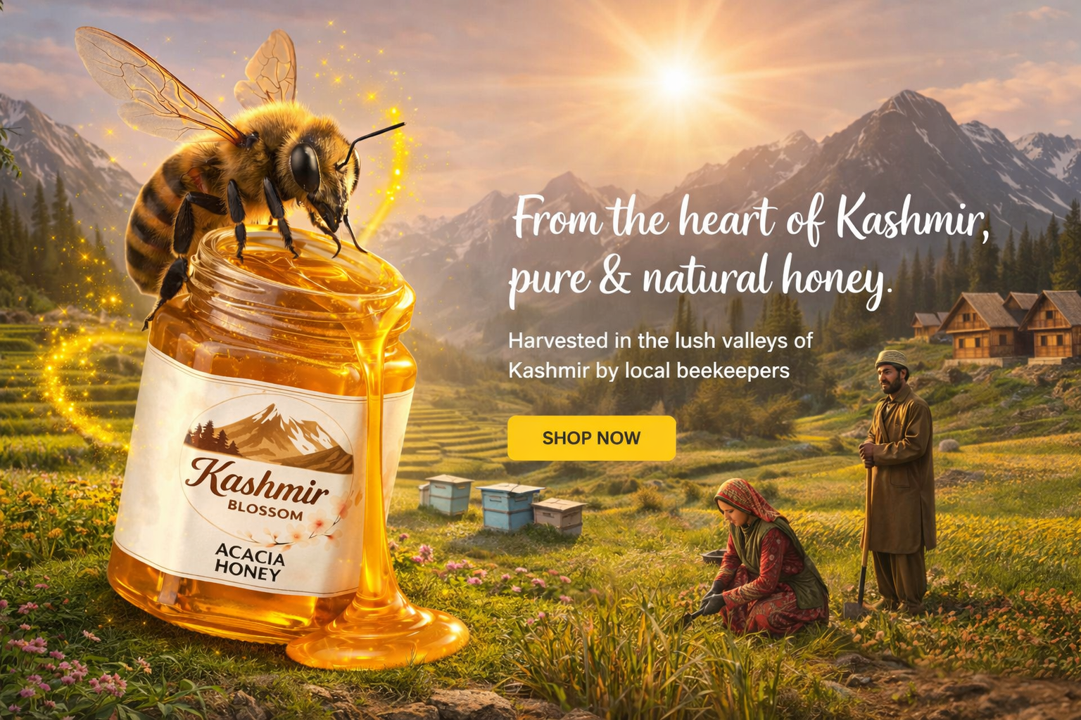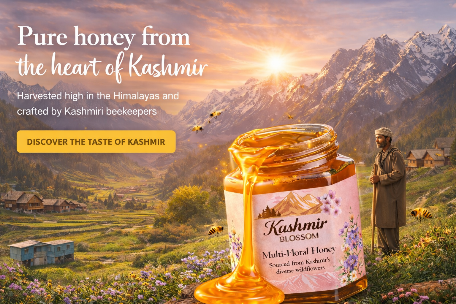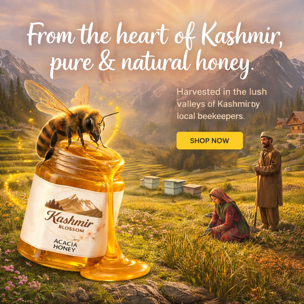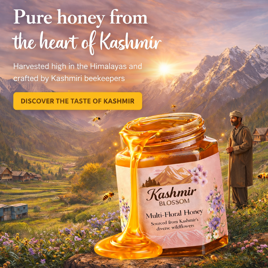 Our honey is gathered from high valleys and wildflower meadows of Kashmir, far from busy roads and factories. Every jar begins with clean mountain air and untouched landscapes.